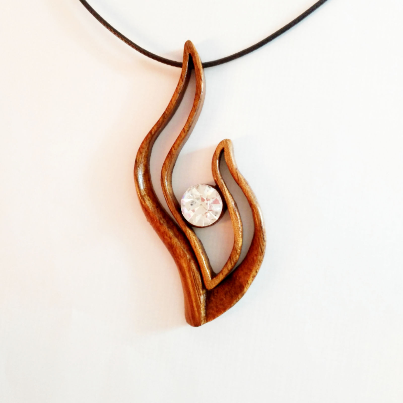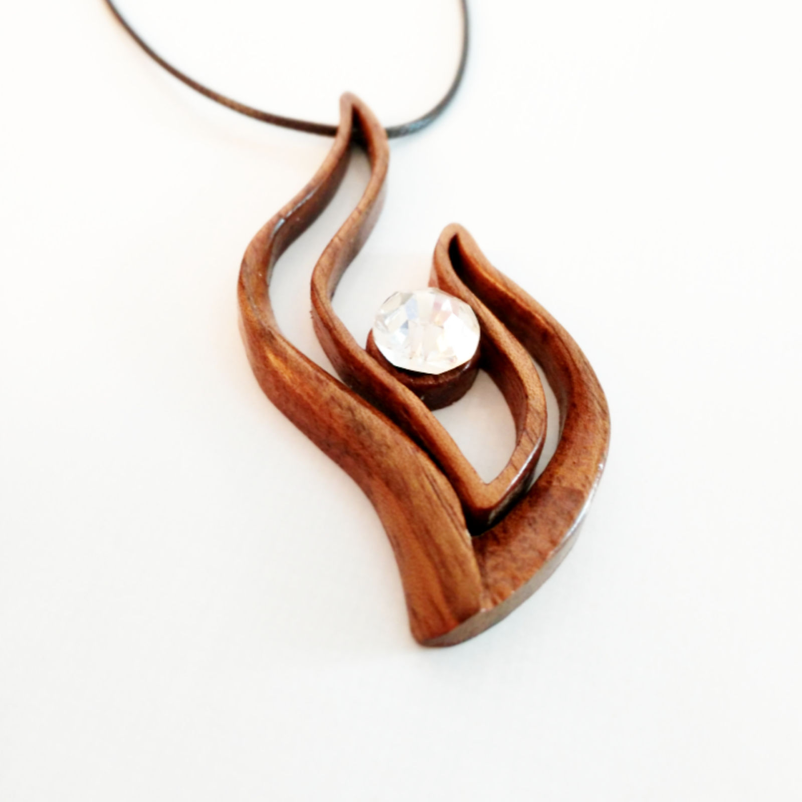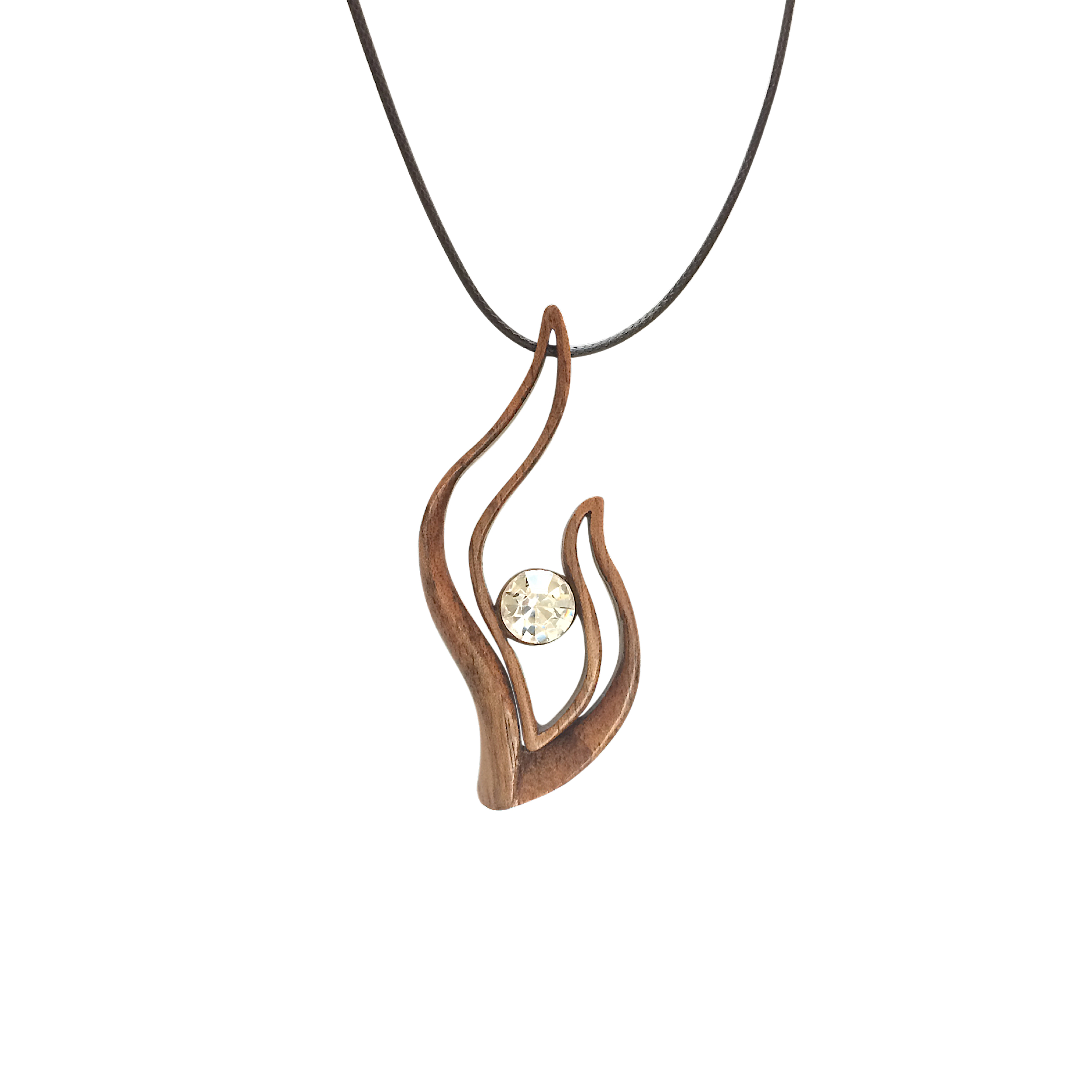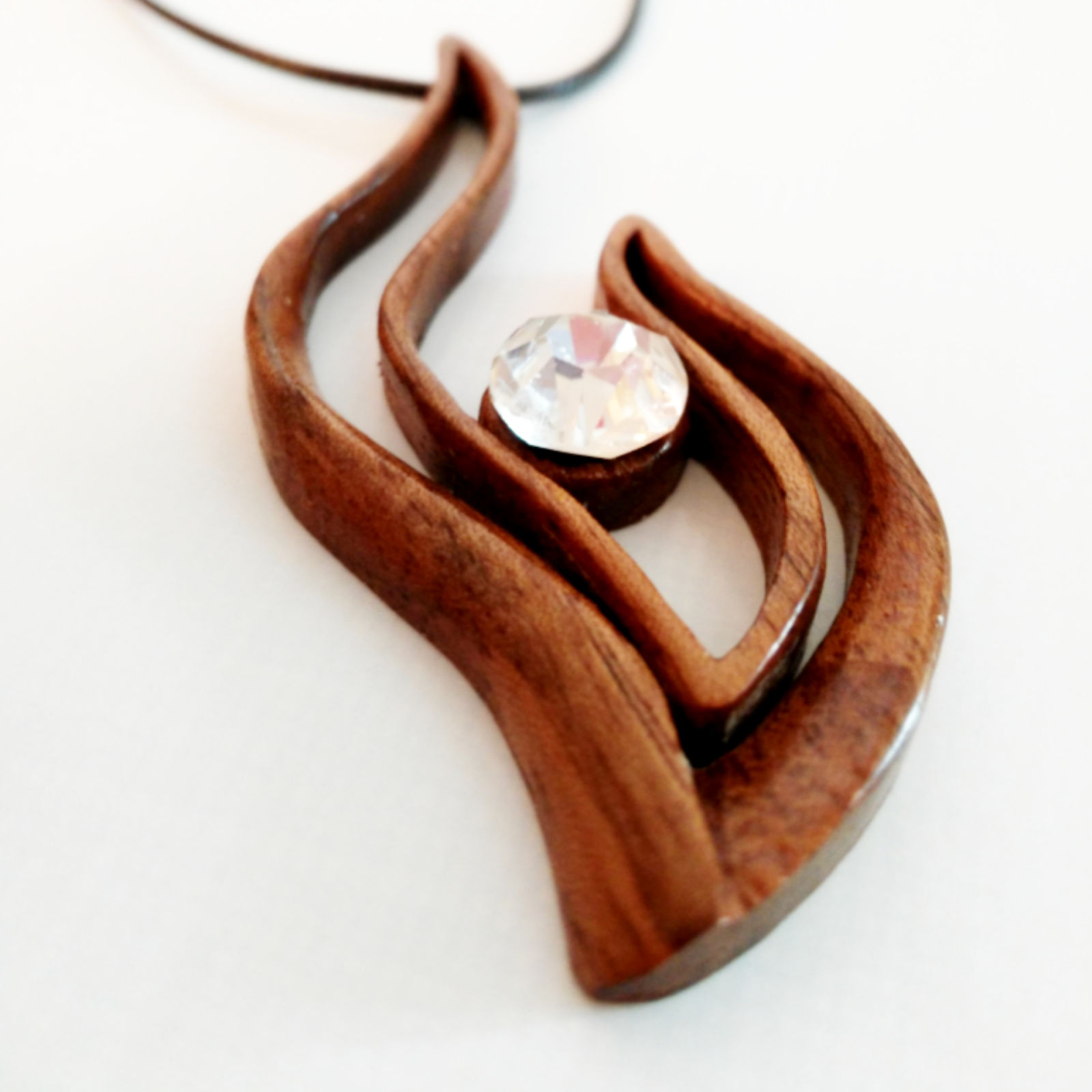 این گردنبند از چوب گردو ساخته شده است.طراحی این گردنبند بسیار خاص و چشمگیر است.در طراحی این گردنبند در قسمت وسط از نگین استفاده شده است، که زیبایی کار را دو چندان نموده است.از روغن گیاهی ازم برای پوشش روی کار استفاده شده است.